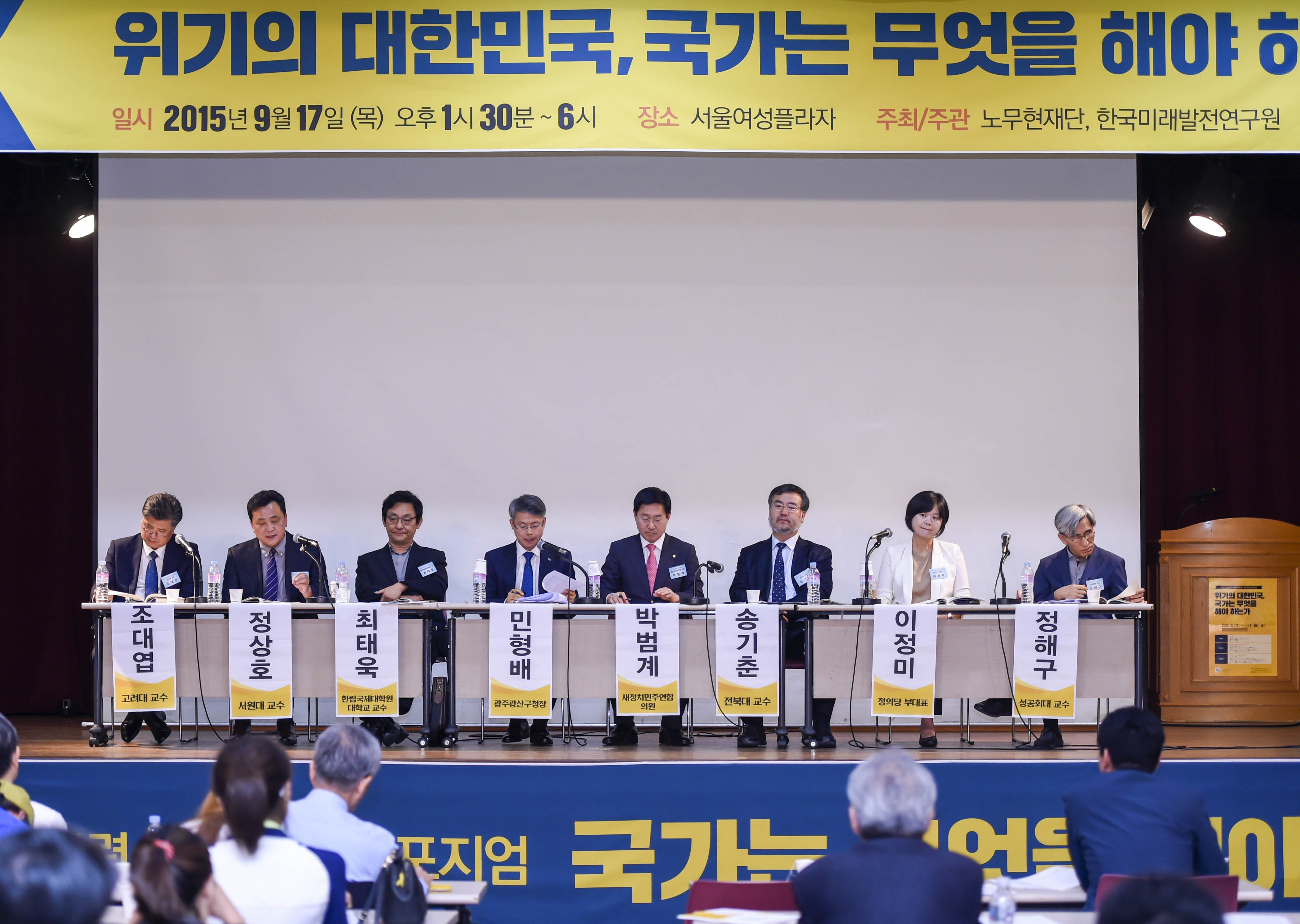 가을이 성큼 다가온 9월 17일 오후 서울 대방동 서울여성플라자 국제회의장. 노무현재단과 한국미래발전연구원이 ‘위기의 대한민국, 국가는 무엇을 해야 하는가’라는 무거운 주제로 노무현 대통령 기념 학술심포지엄 6번째 행사를 마련한 곳.
