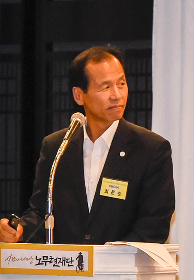 최문순 지사는 “노 대통령이 퇴임하시던 2008년 2월 25일, 뉴욕필 오케스트라 평양 공연 중계를 위해 평양에 있었다. 동평양대극장에 성조기가 걸리고 미국 국가 연주가 전 세계에 생중계되는 것을 보며 더 이상 갈등은 없다는 생각을 했었다”며 “시대가 변하고 세계가 변했는데 우리는 이를 따라잡지 못하고 있다”고 지적했습니다. 아울러 “냉전 종식 25년이 됐는데 그 사실을 받아들이지 못하고 멱살잡이하고 있는 이 상태를 끝내야 한다”며 “결국 우리 내부의 갈등이 냉전을 유지한다고밖에 볼 수 없다. 내부 갈등이 큰 문제”라고 말했습니다.