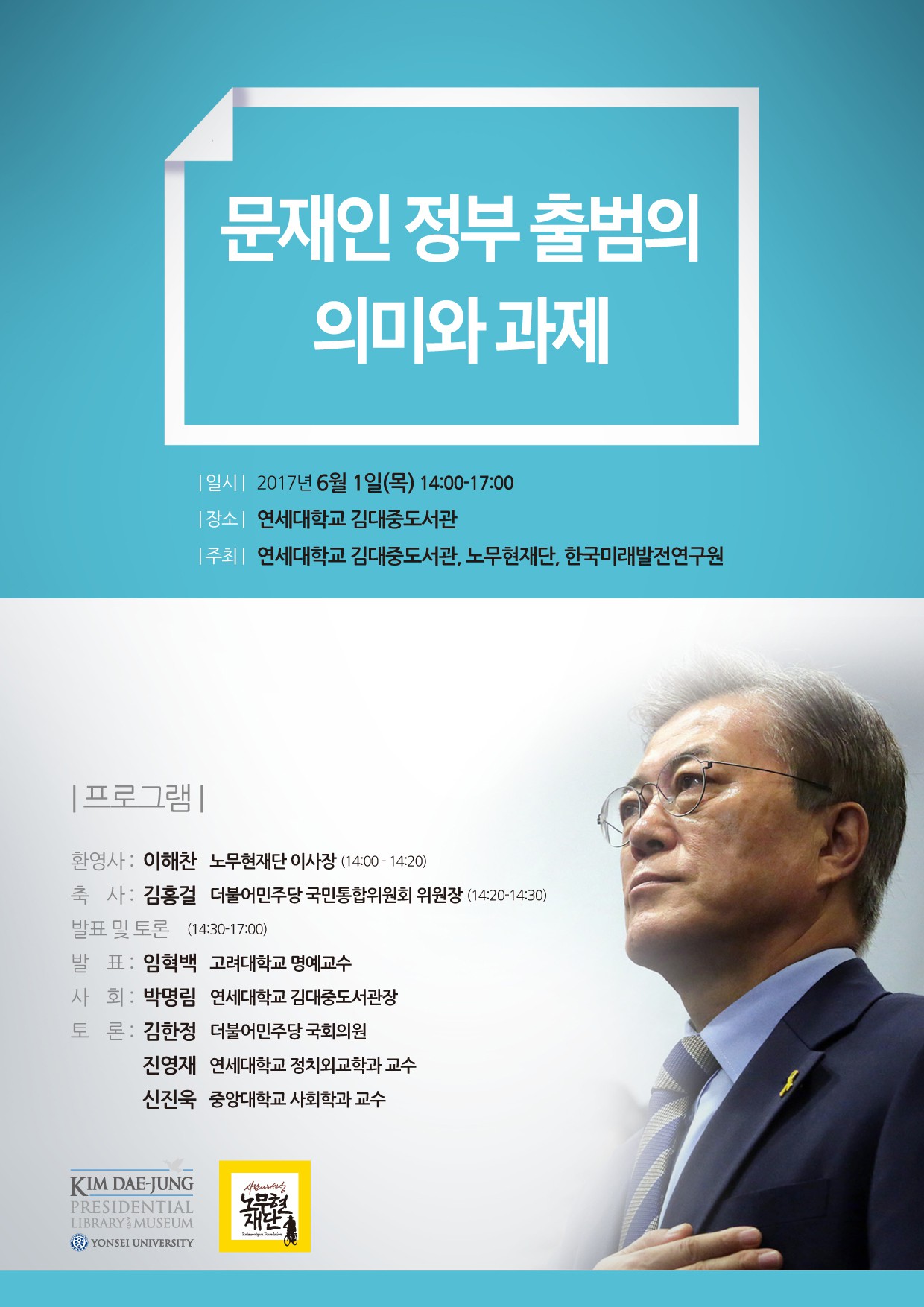 노무현재단이 김대중도서관, 한국미래발전연구원과 함께 학술회의를 개최합니다. 6월 1일(목) 오후2시 서울 연세대학교 김대중도서관에서 진행되는 학술회의 주제는 '문재인 정부 출범의 의미와 과제'입니다.